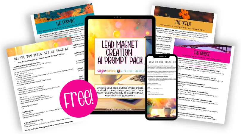 I’m Reneé Leonard, designer and digital-product mentor behind Align & Shine. I help women coaches, educators, and creatives turn half-done ideas into beautiful, sellable digital products using AI and Canva.