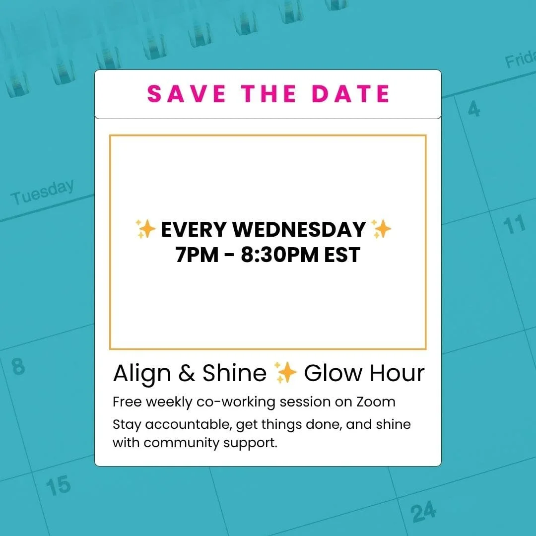 FREE CO-WORKING: Glow Hour is our free weekly co-working session where you can show up, focus, and finally cross those lingering tasks off your list. Every Wednesday on Zoom — bring your to-do’s, your coffee (or tea), and let’s get it done together.